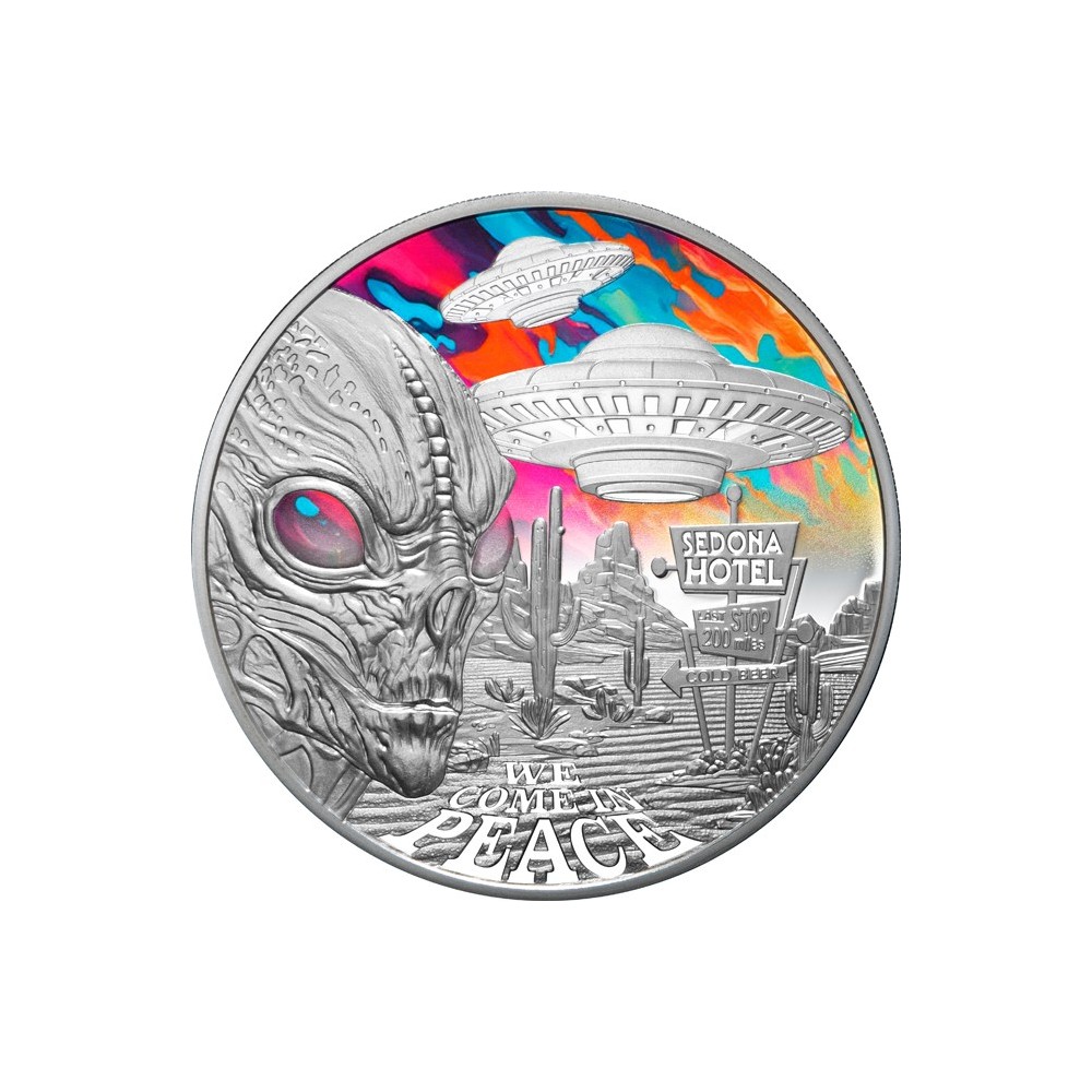 It's not just the spectacular proof-quality minting of this coin that will get your heart racing - the reverse side will give you an eerily detailed look into the soul of an alien from the UFO hotspot, Sedona, Arizona! Sedona is famous for its rugged landscape, dramatic red rock formations, and reputation as a magnet for alien activity! Stamped from 1 ounce of pure 99.9% SILVER, Sedona's ethereal desert landscape stretches into the distance, complete with intricate and fascinating details that give the image a sense of desolate beauty and mystery. What sets this coin apart from others are the bold neon colors of the sky rendered in digital color and eerily reflected in the eyes of the alien - giving this silver coin a cool retro feel that is unique and irresistible!