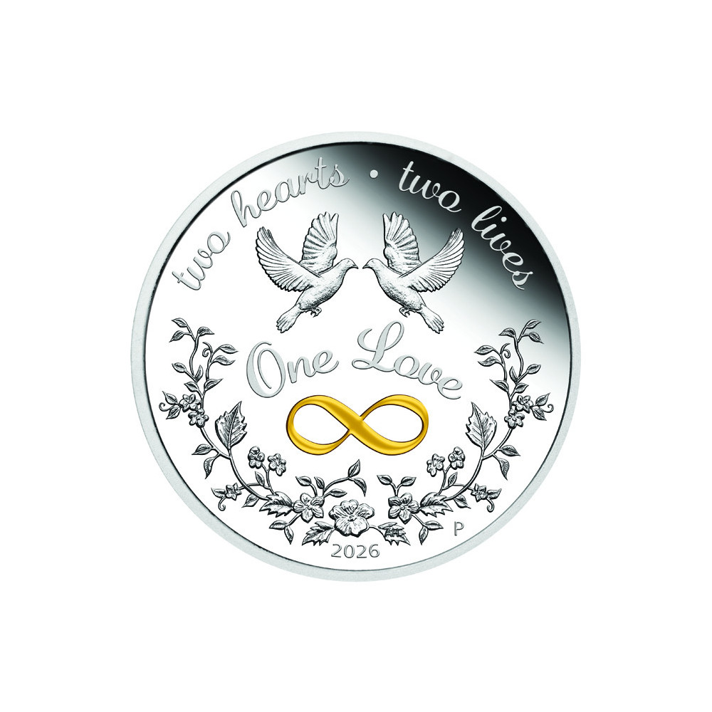 On the reverse of the coin are two pigeons and a colorful infinity symbol and the inscriptions "ONE LOVE", "TWO HEARTS", "TWO LIVES" and the year of mintage - 2026.