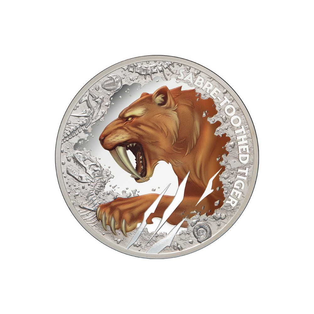 This 1 Oz silver coin captures the predation of the sabre-toothed tiger, one of the most feared predators of the prehistoric world.
