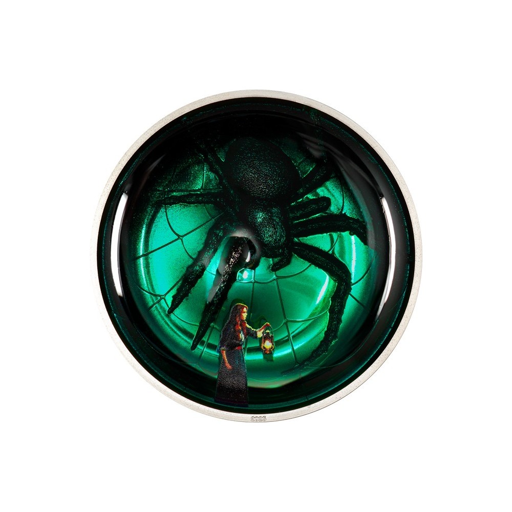 Ši bauginanti 2 oz sidabro moneta, priklausanti serijai "Fobija", atspindi baimės esmę, nes yra nuostabaus dizaino ir nuostabių spalvų, sukuriančių iliuziją, kad auka yra įkalinta monstriško voratinklio glėbyje. Ši sidabro moneta yra prabangios prabos kokybės, pateikiama dėkle kartu su autentiškumo sertifikatu. Ribotas tiražas - tik 999 vienetai visame pasaulyje!