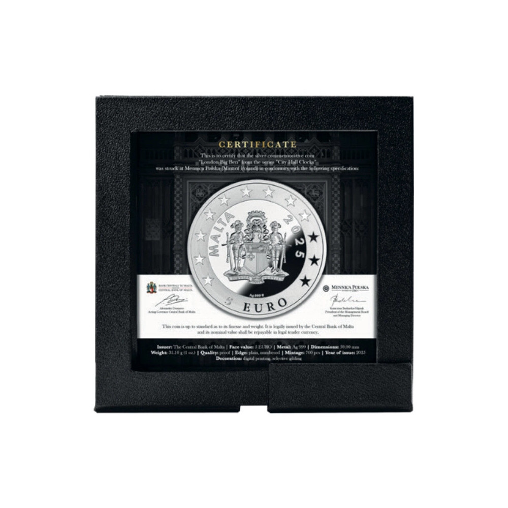 Ši išskirtinė 1 uncijos sidabro moneta yra antroji "City Hall Clocks" serijos moneta, kuri tiksi Londono ritmu. Big Benas. Sublime. Nepalaužiamas. Perskrodžia miglotą orą virš Temzės. Kas ketvirtį valandos suskamba "Westminster Quarters". Akys pakeliamos, kai žingsniai aidi nuo grindinio. Įkvėpkite vėsaus oro. Širdis užburia garso banga. Vis dar ištiesta ranka. Nenuilstamai išgyvenęs Antrojo pasaulinio karo siautulį. Ištvermės įrodymas, išlietas iš įrodymo tobulumo. Moneta užantspauduota dėkle su autentiškumo sertifikatu. Pasaulyje išleista tik 700 vienetų.